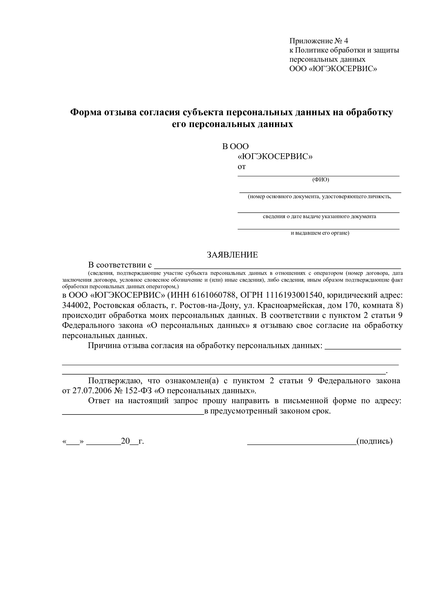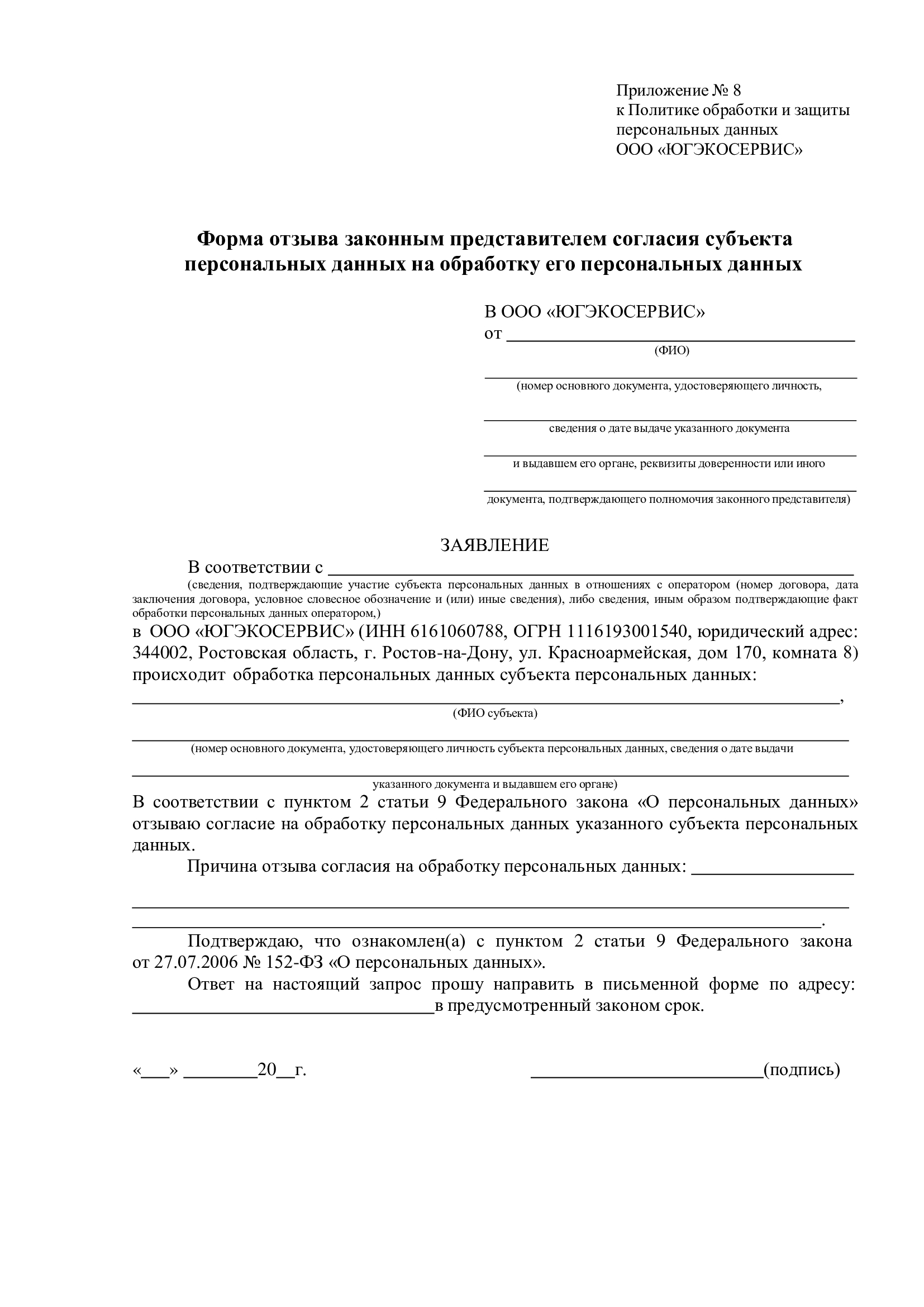 6.11. Для отзыва согласия на обработку данных субъект (или представитель) заполняет форму отзыва (Приложение 4 или 8) и передает его указанным способом. Отзыв согласия не препятствует обработке данных при наличии оснований, перечисленных в пп. 2–11 ч. 1 ст. 6, ч. 2 ст. 10 и ч. 2 ст. 11 Федерального закона № 152-ФЗ.
