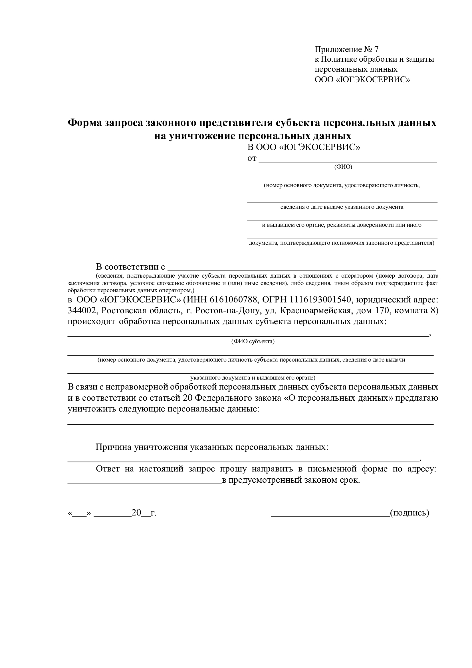 6.10. Для исключения неправомерной обработки данных субъект (или представитель) заполняет форму запроса на уничтожение (Приложение 3 или 7) и направляет его в порядке, предусмотренном п. 6.8.